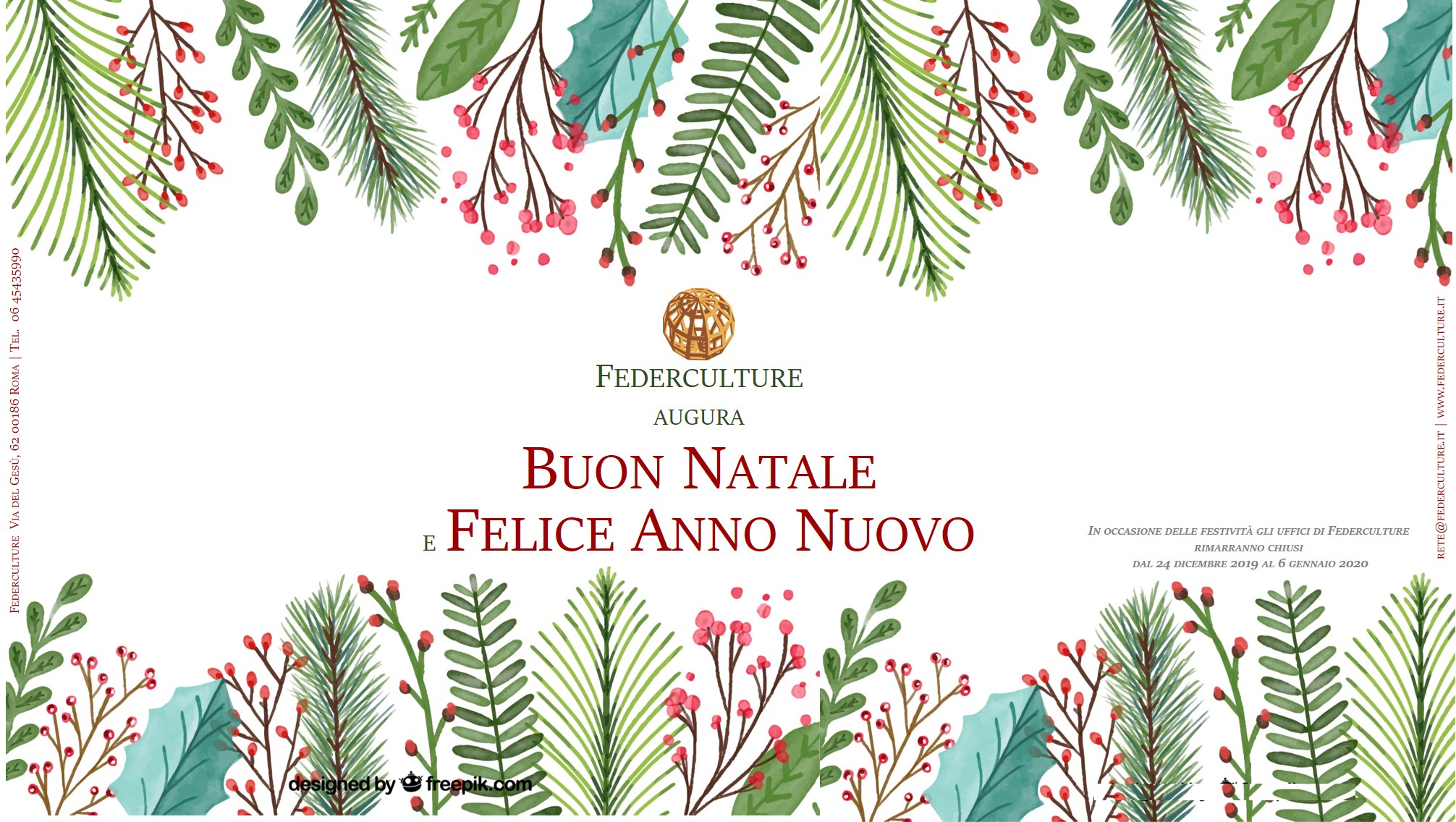 Federculture augura Buone Feste e Felice Anno Nuovo e ricorda che in occasione delle festività gli uffici rimarranno chiusi dal 24 dicembre 2019 al 76 gennaio 2020.