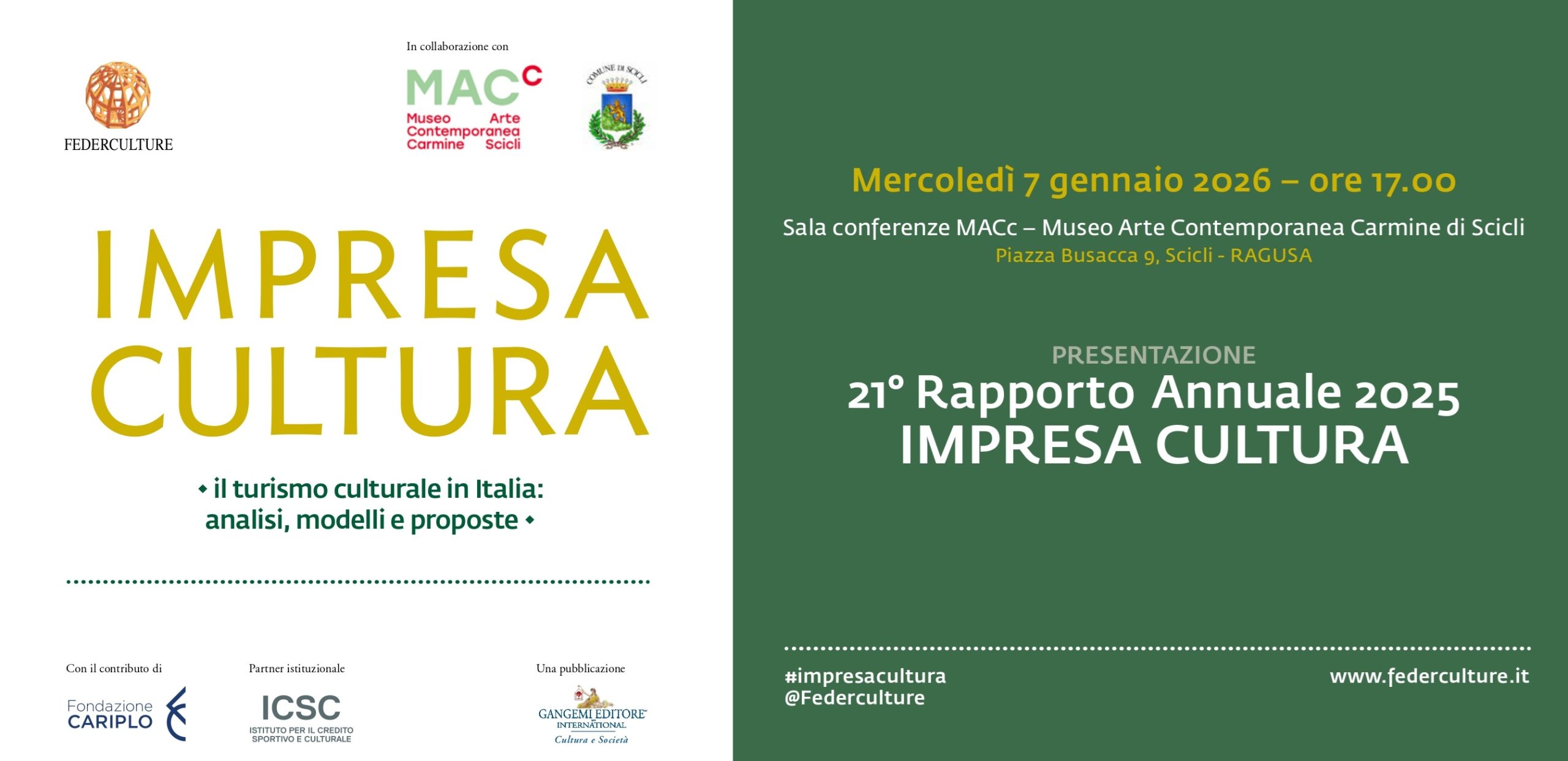 Il nuovo anno sarà aperto da una nuova tappa delle presentazioni regionali di IMPRESA CULTURA 2025 il 21° Rapporto Annuale di Federculture che mercoledì 7 gennaio 2026 sarà presentato a Scicli (RG).