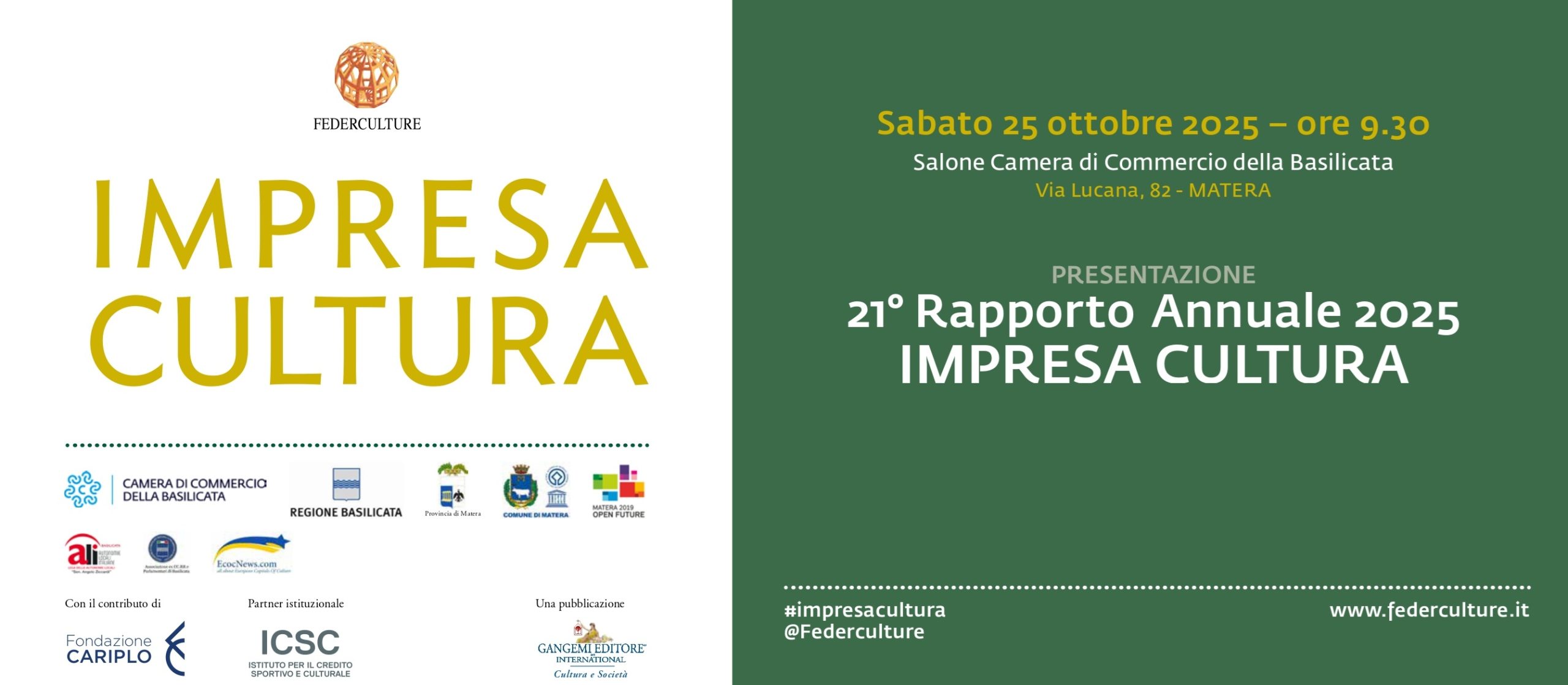 Ancora una tappa per le presentazioni regionali di IMPRESA CULTURA 2025 che sabato 25 ottobre 2025 alle ore 9.30 sarà presentato a Matera nel Salone della Camera di Commercio della Basilicata (via Lucana, 82 – Cremona).