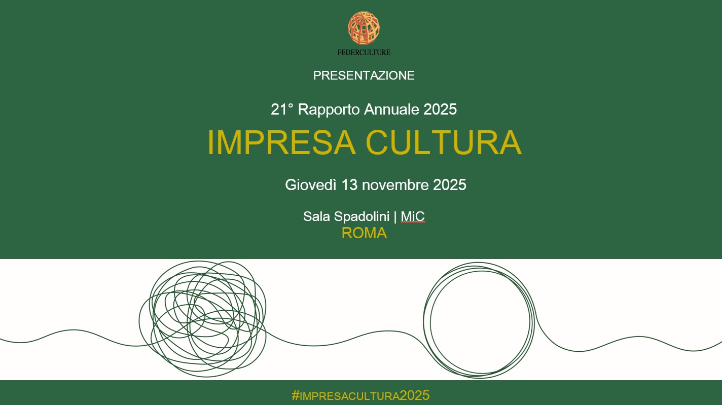 Sarà presentato a Roma, presso la Sala Spadolini del Ministero della Cultura (Collegio Romano) giovedì 13 novembre il 21° Rapporto Annuale Federculture IMPRESA CULTURA.