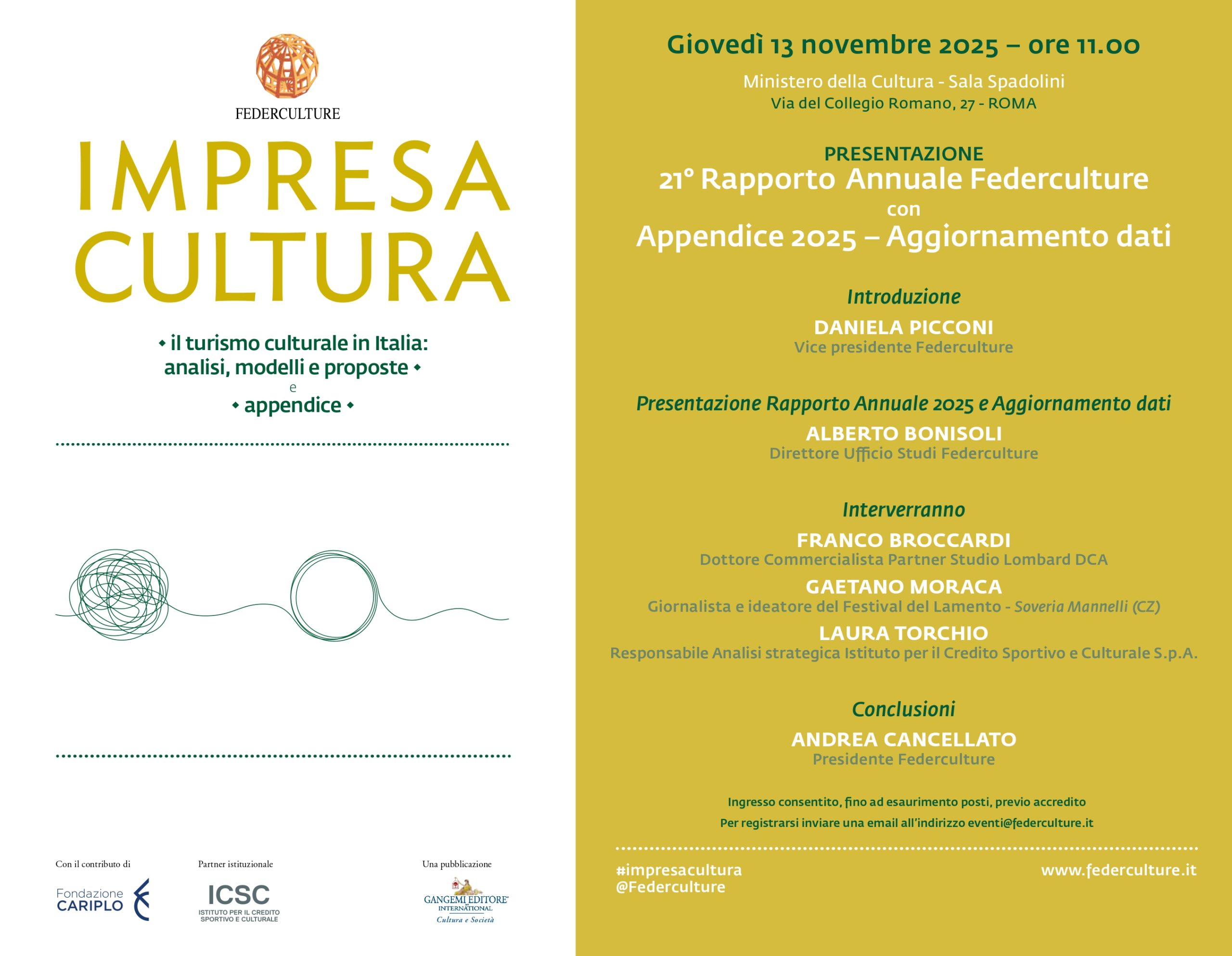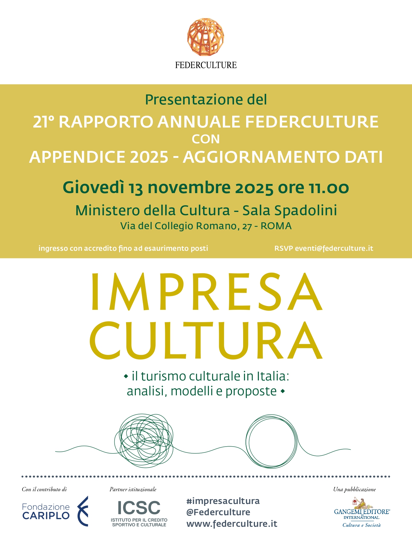 Sarà presentato a Roma, presso la Sala Spadolini del Ministero della Cultura (Collegio Romano) giovedì 13 novembre il 21° Rapporto Annuale Federculture IMPRESA CULTURA.